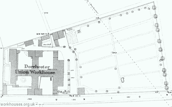 The new Union workhouse was built in 1836 at the west of Dorchester, on what became known as Union Road, renamed Damers Road in about 1900. Designed by George Wilkinson, it followed the popular cruciform plan. A chapel was added in about 1900.
