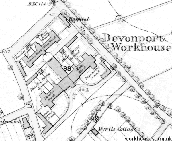 On 26th July, 1866, the workhouse was visited by Dr Edward Smith, a Poor Law Inspector, and Medical Officer of the Poor Law Board. He described the Stoke Damerel workhouse as a new workhouse "admirably situate". He also reported that there is a detached infirmary constructed with a side corridor and having external windows on 1 or 2 sides of the wards. The wards — large, light, airy. Wards for general sick, 2 sick nurseries and VD wards (into which itch cases are exceptionally admitted). There are no separate fever wards. There is a room in which a smallpox case might be placed. There is a foul ward but offensive cases are usually placed in a separate ward. One sick ward for medical and one for surgical cases although the distinction is not strictly maintained. The infirmary has a warming and a cooling kitchen. WCs at ends of building (there are 11). Moveable baths. WCs in garden. Ventilation is chiefly by windows and fireplaces. Vents in floor so small as to be ineffective. Large panes of perforated zinc over each door leading from the corridor, and a lattice work in the corridor allows free ventilation from end to end. There is 1 paid nurse for 120 patients. Number of sick on this day — 115; inmates — 417.
