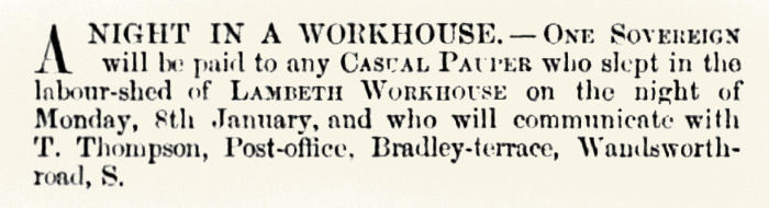 It was placed by Joseph Charles Parkinson, a civil servant and journalist with an interest in social issues and particularly in the conditions that existed in workhouses. The date mentioned in the advertisement, January 8th, had been the occasion of reporter James Greenwood's undercover visit to the establishment, the account of which had caused a sensation when it was published a few days afterwads in three successive editions of the pall Mall Gazette. By contacting others who had been inmates of the Lambeth casual ward on the same night, Parkinson hoped to ascertain the veracity of Greenwood's report.