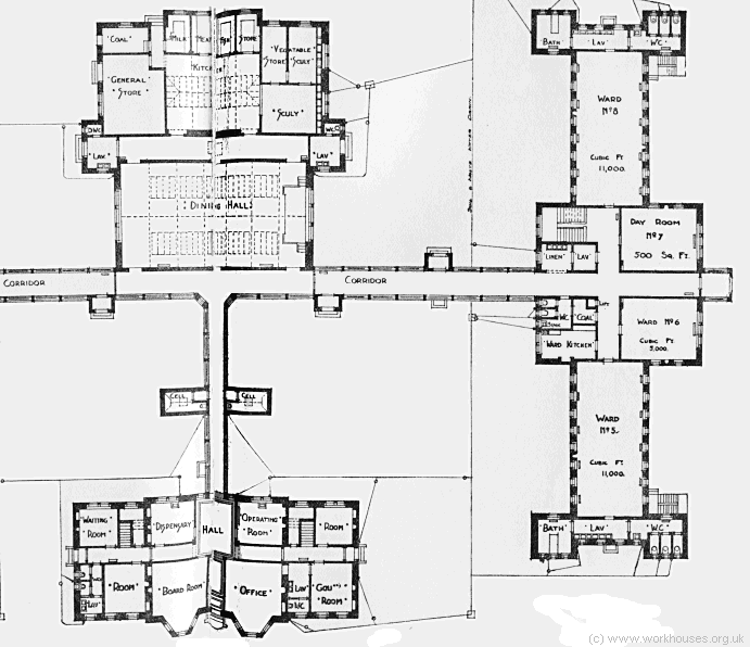 The buildings adopted the popular pavilion-plan layout. A central administrative block contained three-storey section at the south contained a board room, offices, clothing store, matron's room, and dispensary on the ground floor; governor's quarters and nurses' accommodation on the first floor; and servants' quarters on the second floor. This connected through to a single-storey portion at the north where the dining-hall, kitchen and stores were located. A central corridor connected the central block to three-storey ward blocks at each side with male wards were placed at the east and female at the west. Each ward block floor comprised two large 18-bed wards either side of a central area containing a kitchen, stores etc. and either a third large ward, or small ward plus day room. Aged and infirm inmates were placed on the ground floor, sick inmates on the first floor, and 'turnouts' on the second floor. The ground floor plan showing the administrative and male ward blocks is shown below.