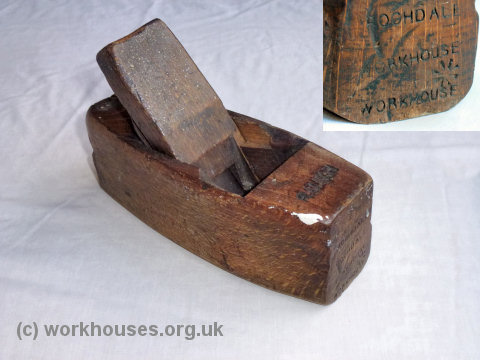 | A wooden plane from the Rochdale workhouse Lancashire, stamped — like all workhouse property — with the union's name to deter theft. It also bears a maker's mark 'Ebor Works, York'. |