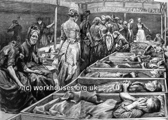 The idea that workhouse beds were in the form of a row of coffin-like wooden boxes is probably due to a frequently reproduced 1867 illustration of the new St Marylebone casual ward, where vagrants were allowed to stay for one night. Its beds were indeed coffin-like but they were never used in the main workhouse.